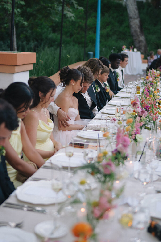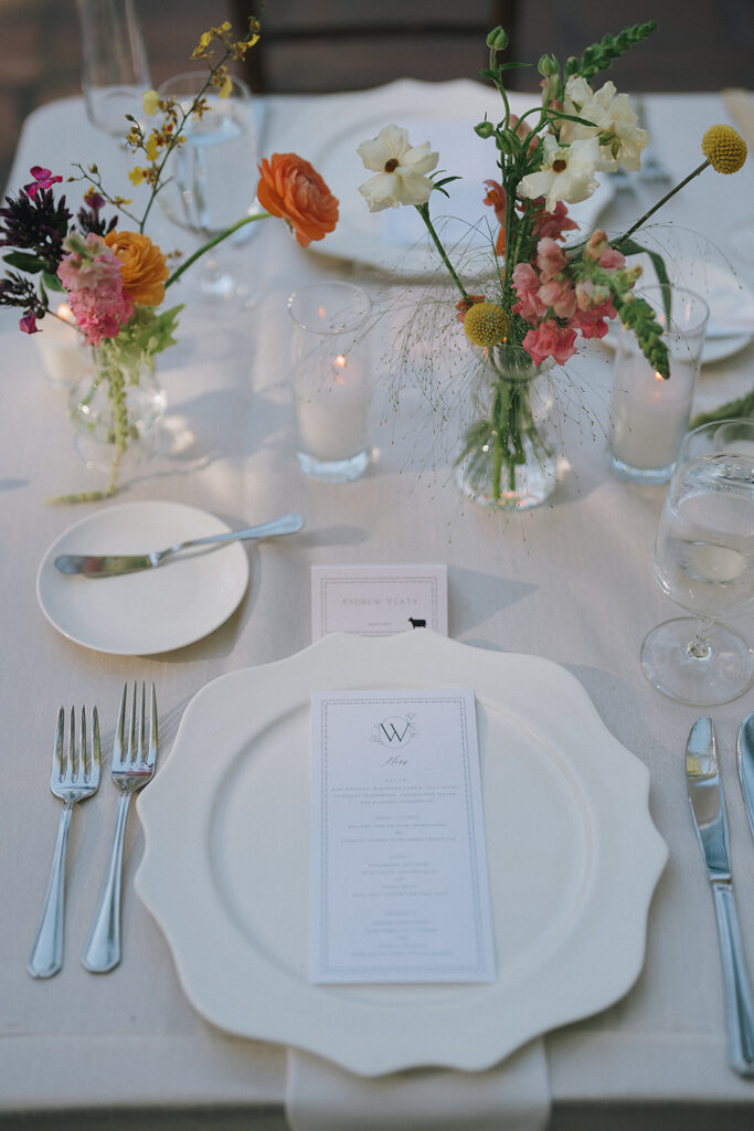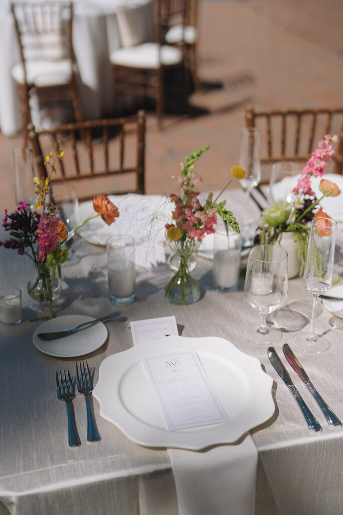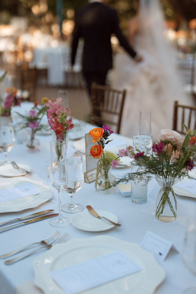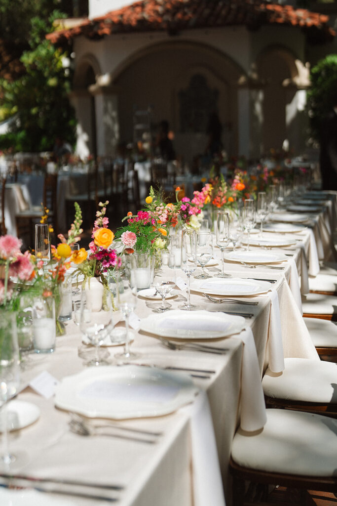 The wedding reception layout consisted of long tables set for a relaxed, family-style dinner. White linens, warm candlelight, and scattered bud vases filled with warm blooms ran down the tables, creating a reception design that incorporated their bright color palette tastefully.