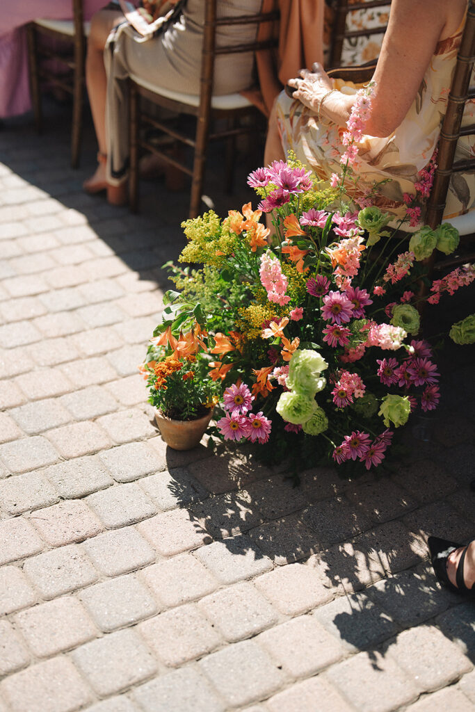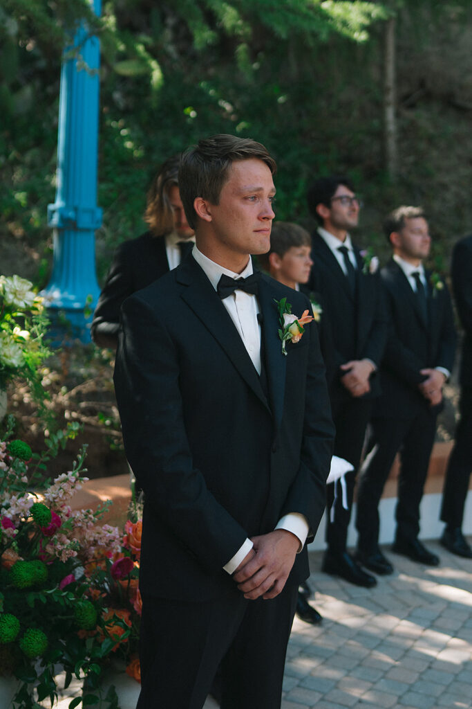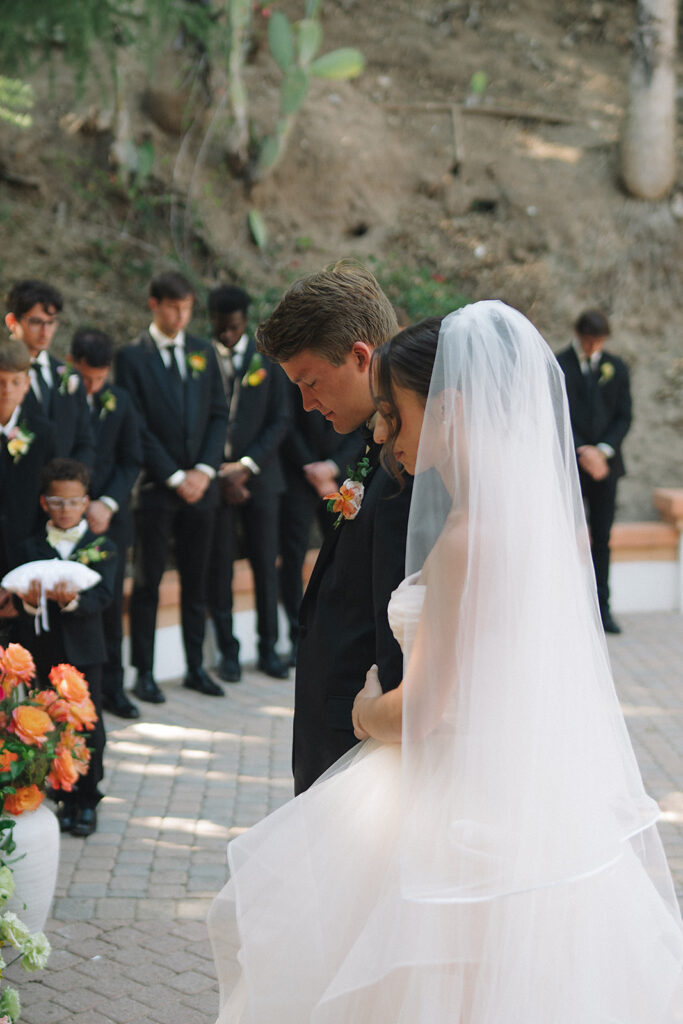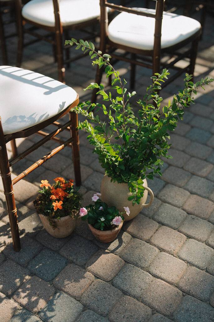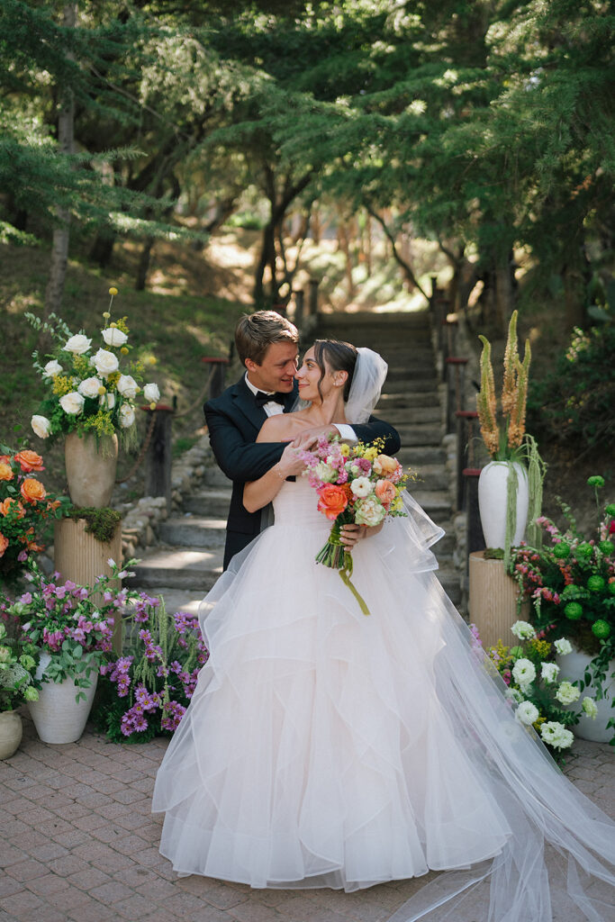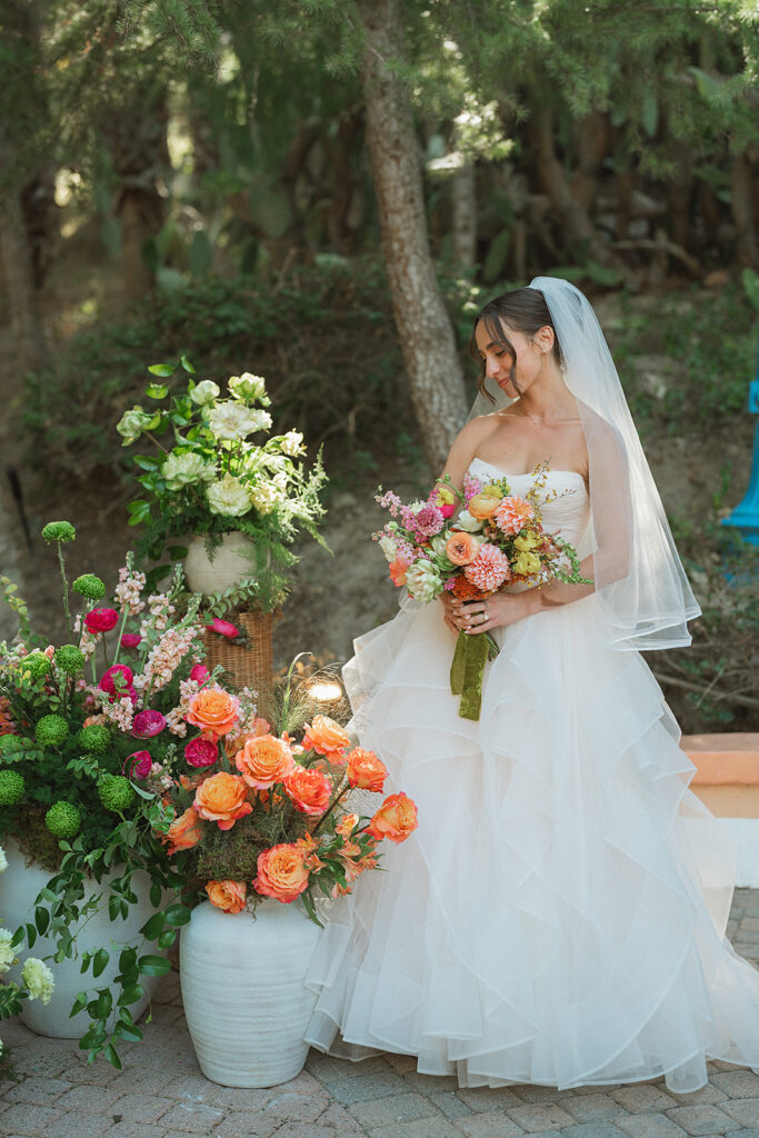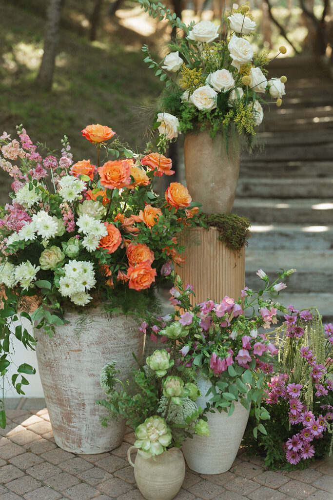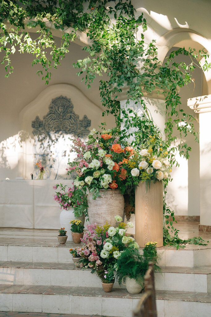 The ceremony space set the tone for the day with pots of varying heights filled with loose, organic floral arrangements lining the aisle and forming a whimsical arrangement at the foot of the Rancho Las Lomas staircase where the couple said their vows. This ceremony design highlighted the natural beauty of the orange county wedding venue maintaining a soft, textural, and garden-inspired style.