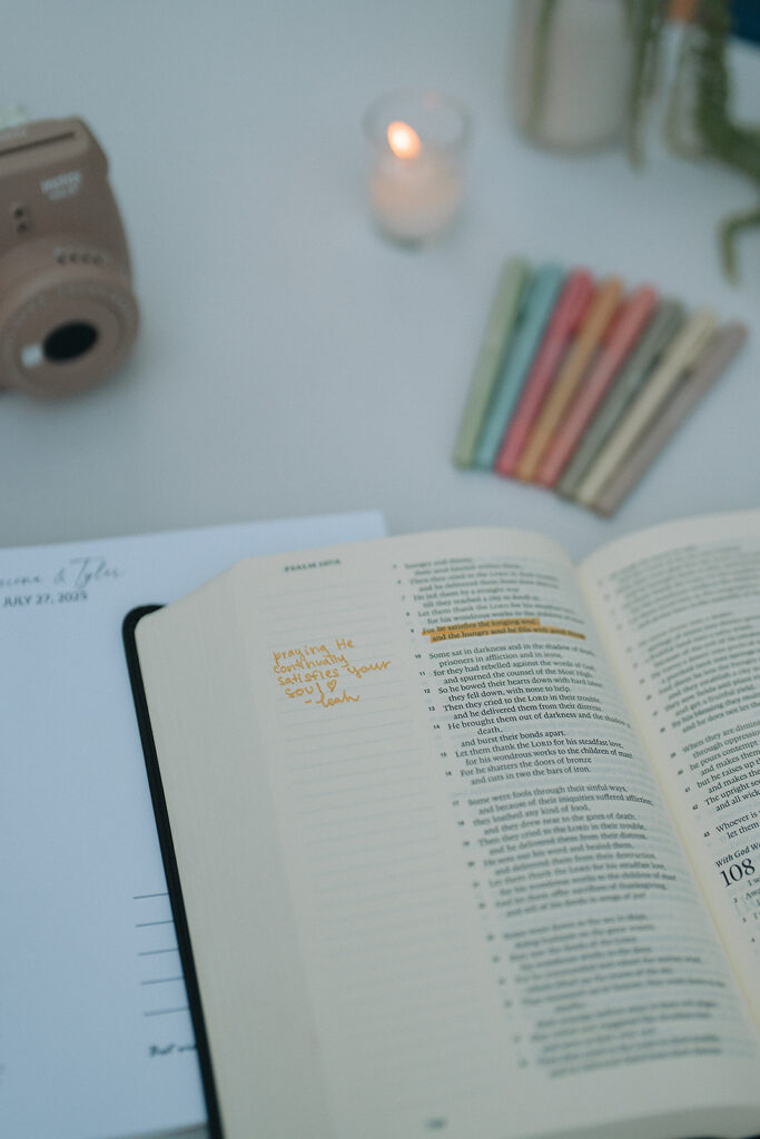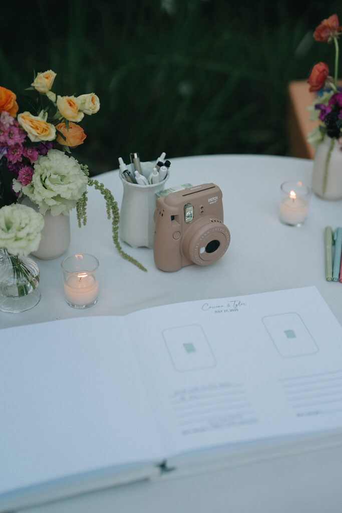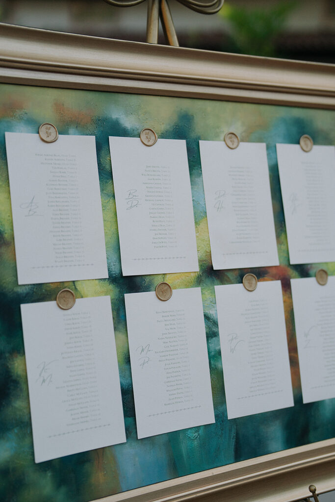 Guests enjoyed a polaroid sign-in book and found their assigned seats with an alphabetized seating chart. Each list of names was fastened to a beautiful, framed art piece with a wax seal, a creative spin on the mirrored seating chart trend we’ve seen in the last few years. Our most favorite detail of the night was a bible on the welcome table; each guest was asked to highlight or circle a meaningful piece of scripture and write a message to the couple beside it.